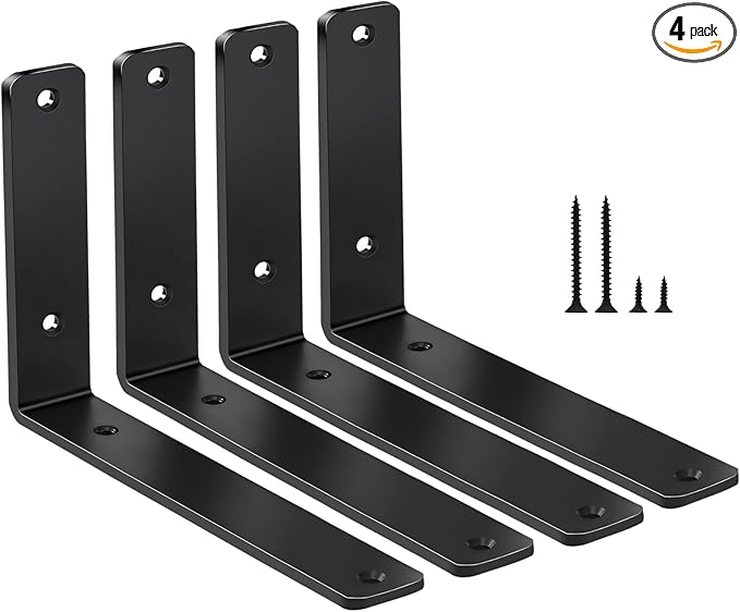 12 heavy-duty 10″ matte black L brackets, 5 mm steel. Each pair supports up to 100 lb. Includes screws for easy DIY installation.