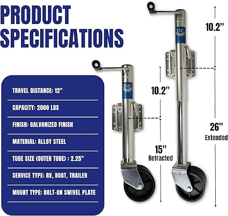 Swivel tongue jack with wheel for smooth lifting and easy trailer maneuvering.