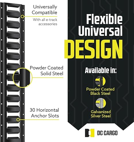 Durable 5ft black powder-coat E-Track rails. Secure cargo with heavy-duty strength for trailers, trucks, and enclosed haulers.